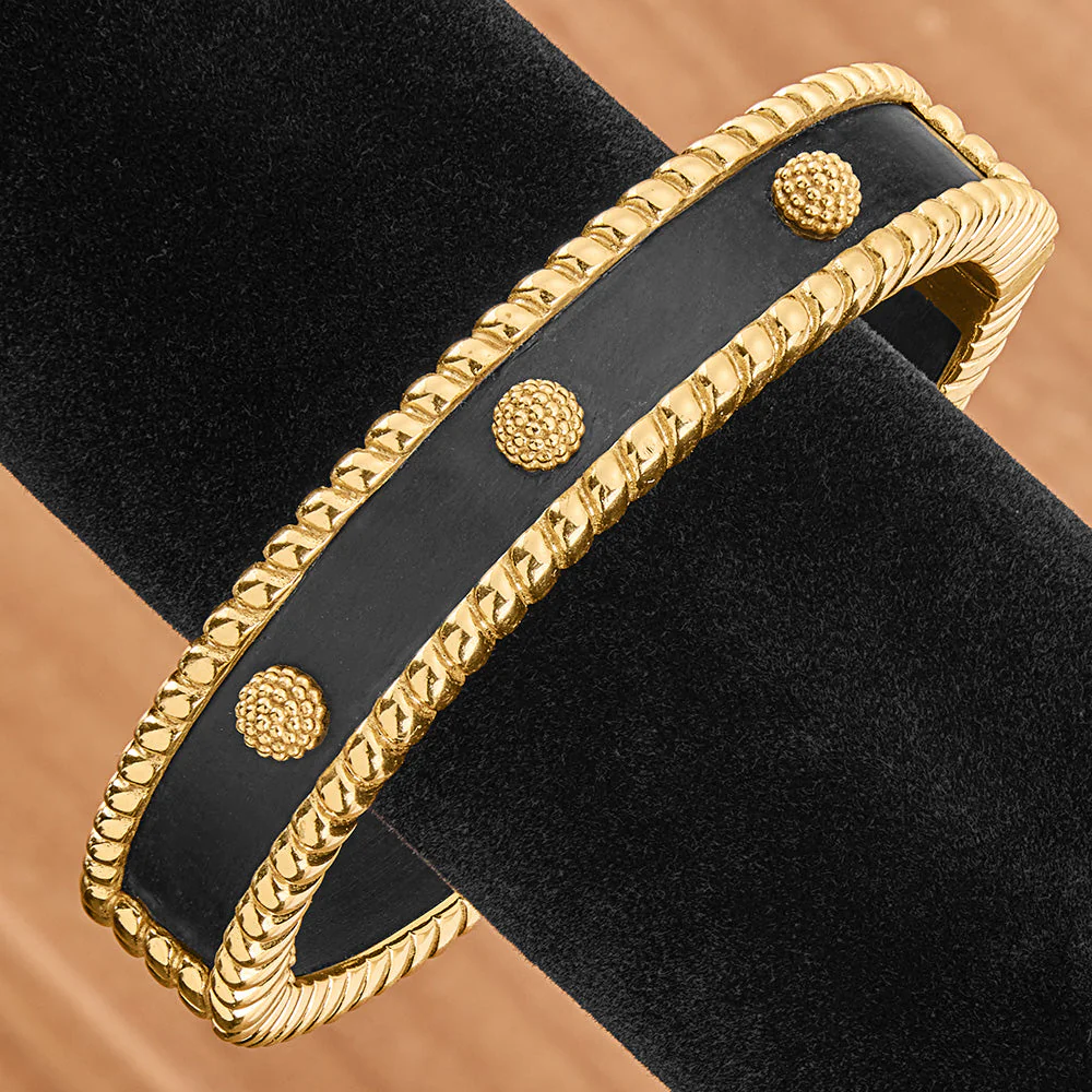 Featuring natural wood surrounded by rich gold, this bangle will mix, match and stack alongside other bracelets for everyday adventures. It can elevate a pair of jeans or bring a splash of glamour to a business suit.